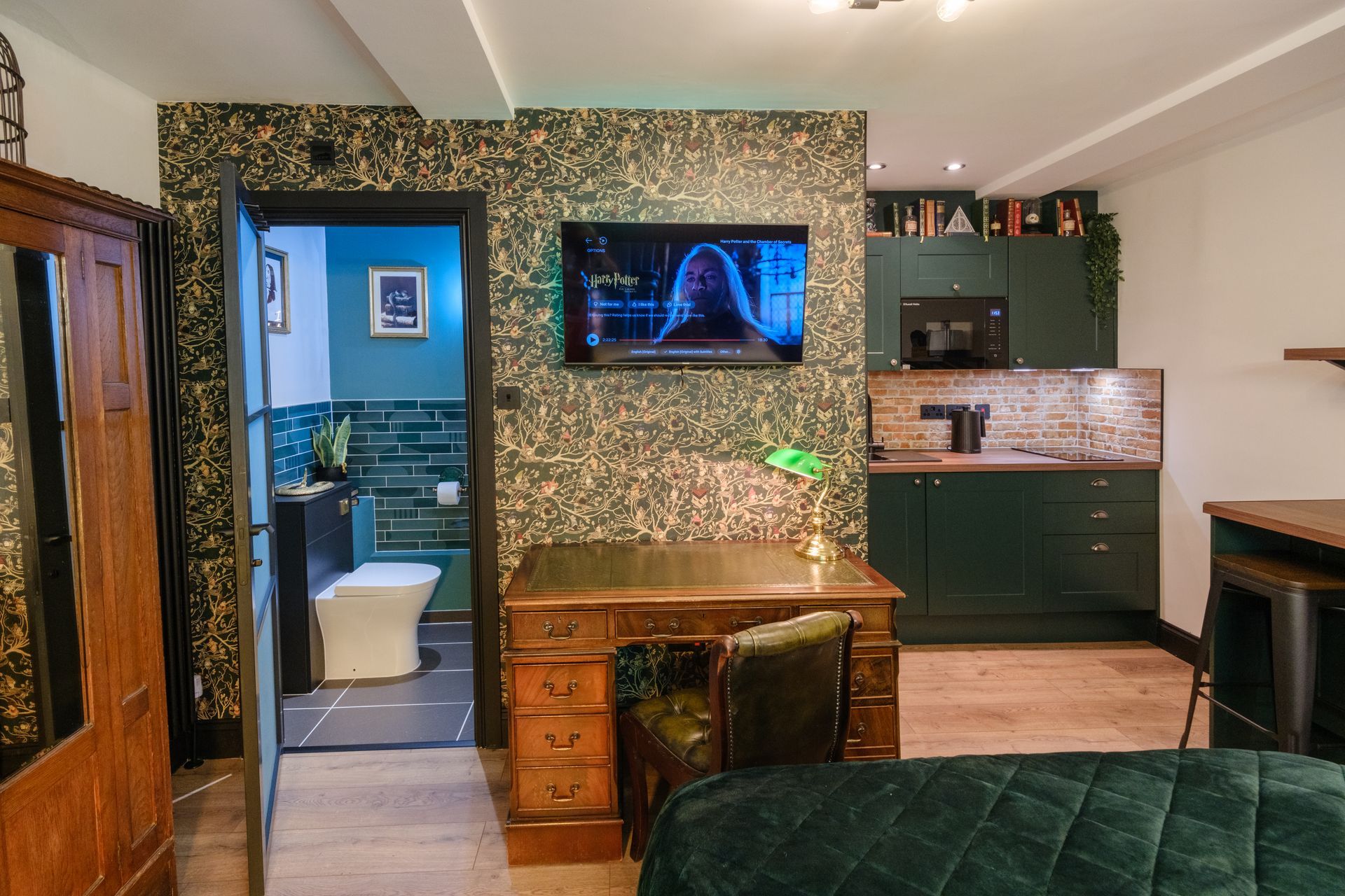Step into the Serpent’s Studio Room, a newly designed themed room only 3.5 miles (around 10 minutes by car) from the Warner Brothers Studio Tour. Perfect for couples or small families, this magical hideaway blends comfort with enchanting details to make your stay truly unforgettable.